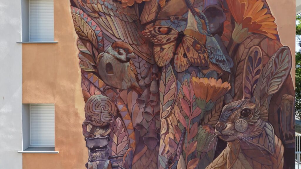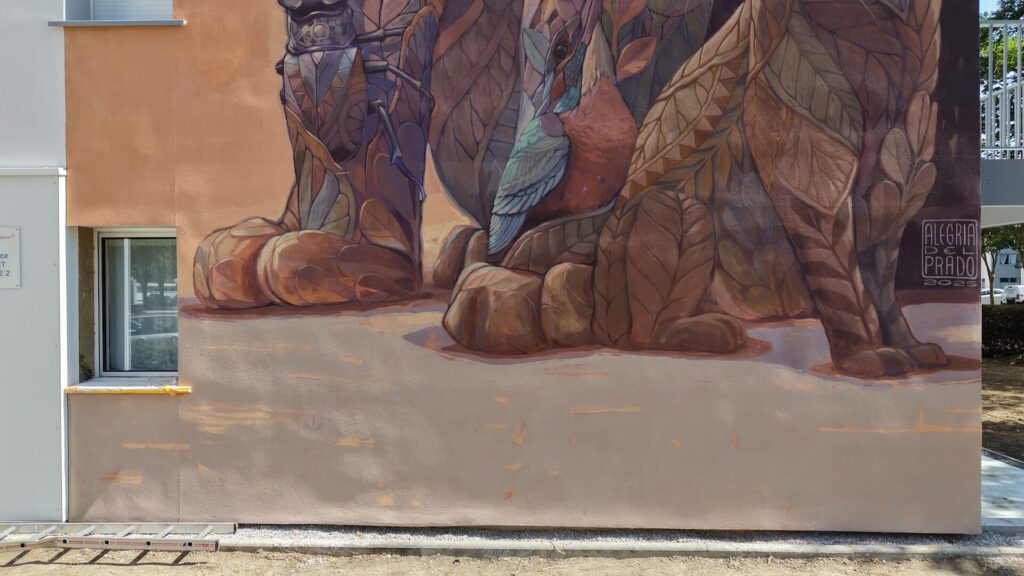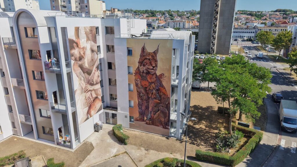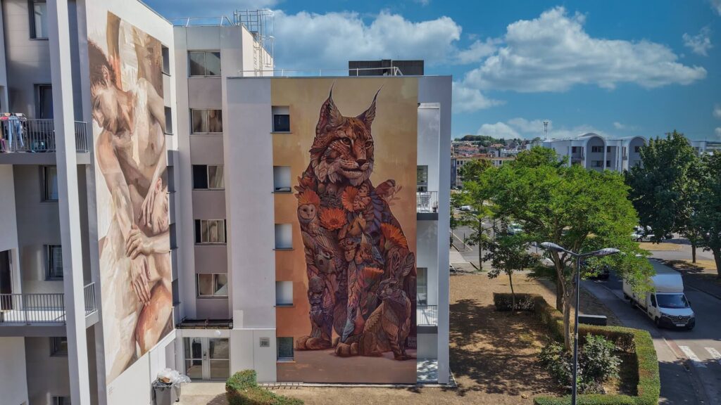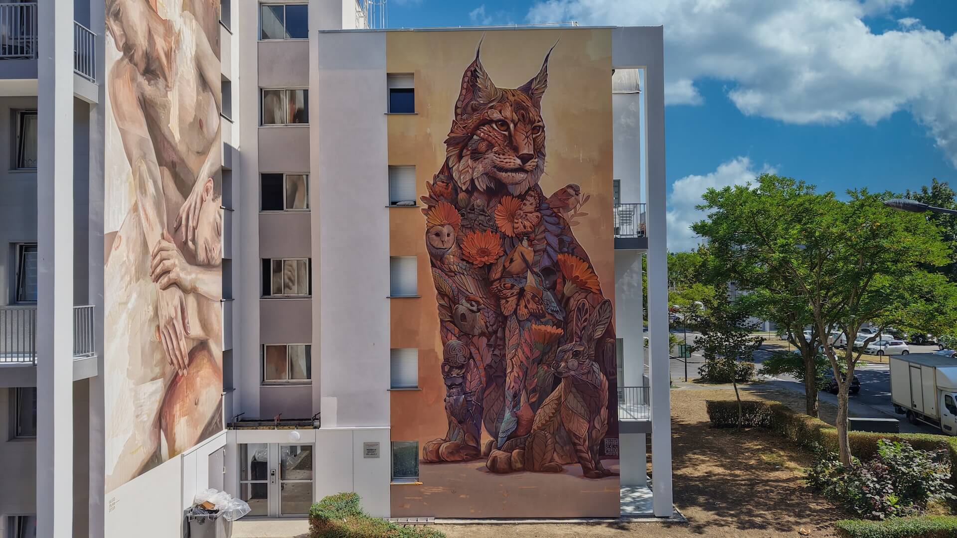 C’est une œuvre surréaliste, onirique et magnifique. A côté des danseurs de Guido Palmadossa et du petit garçon de Madagascar signé Edoardo Ettore, la fresque réalisée par le duo Alegria Del Prado emmène le spectateur dans un monde imaginaire et poétique ou la nature est reine. « Nous avons voulu apporter quelque chose de la nature sauvage dans ce quartier » explique le duo. « La figure centrale de la fresque est un lynx, plus grand félin d’Europe, présent de manière très discrète en France. C’est un animal resté longtemps méconnu. Il s’agit du félin dont la répartition est la plus large en Europe occidentale. Nous avons voulu mettre en avant cet animal que, pour des raisons sociales, on ne voit pas souvent. »