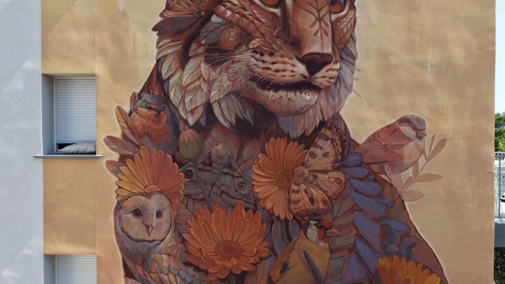C’est une œuvre qui ne ressemble à aucune autre. Composée par le duo Mexicano – espagnol Alegria Del Prado, un magnifique lynx est apparu. Si l’animal regarde ailleurs, observez-le avec attention et partez à la recherche des moindres détails qui sont autant de surprises et d’odes à cette nature cachée que l’on ne voit plus entre papillons, fleurs, oiseaux, feuilles, escargot, lièvre et scarabée.