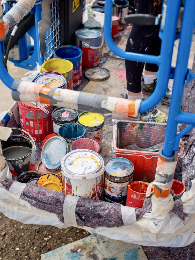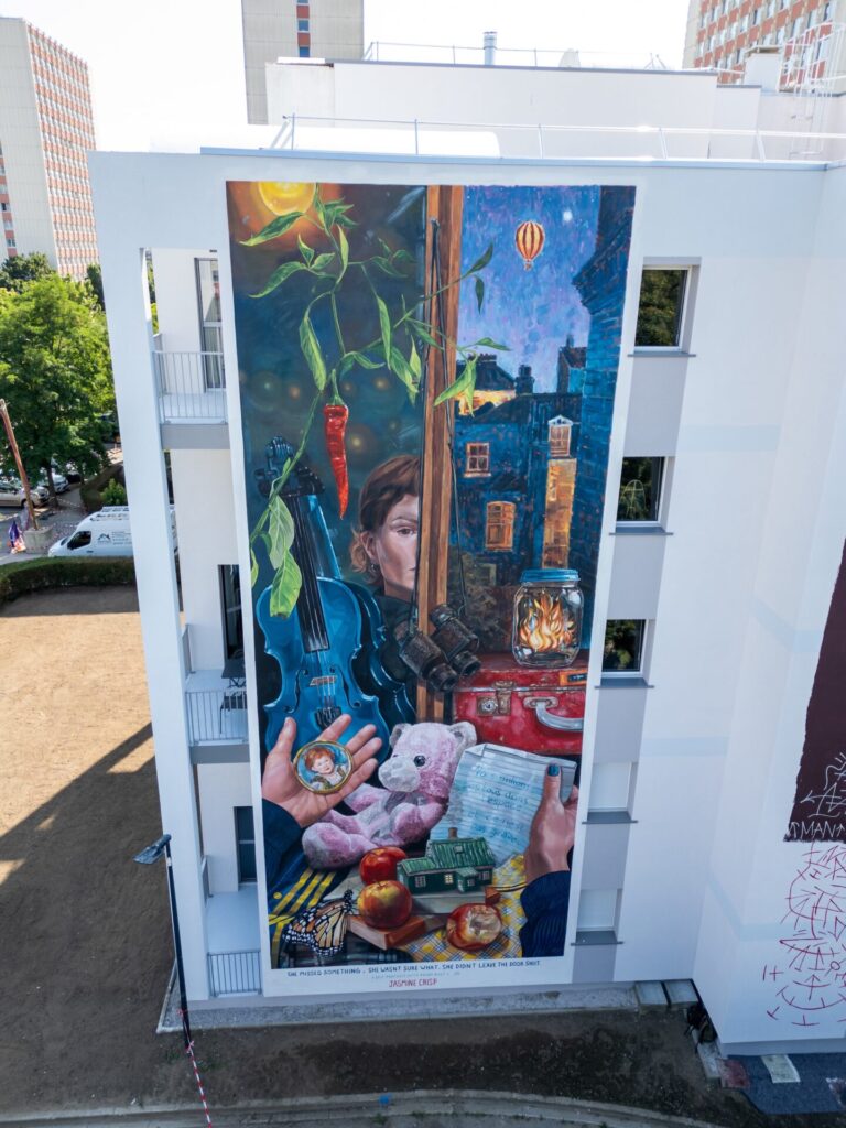 Perchée à plusieurs dizaines de mètres de hauteur, la jeune Australienne peint furieusement. Casque vissé sur les oreilles, Jasmine Crisp aime créer en dansant pour se laisser emporter par une énergie créatrice remplie de bonnes ondes. La même joie et bienveillance se dégagent de la jeune femme lorsqu’elle décrit son œuvre : « L’idée générale de cette peinture est la question suivante : « Si tu dois recommencer ta vie, quels objets emmènerais-tu dans une valise pour débuter cette nouvelle aventure ? » explique l’artiste. « C’est bien sûr une valise miraculeuse car les objets représentés ici ne tiendraient pas dans un bagage classique. C’est une collection fantastique de souvenirs et de choses du passé que j’aimerai emmener avec moi. »