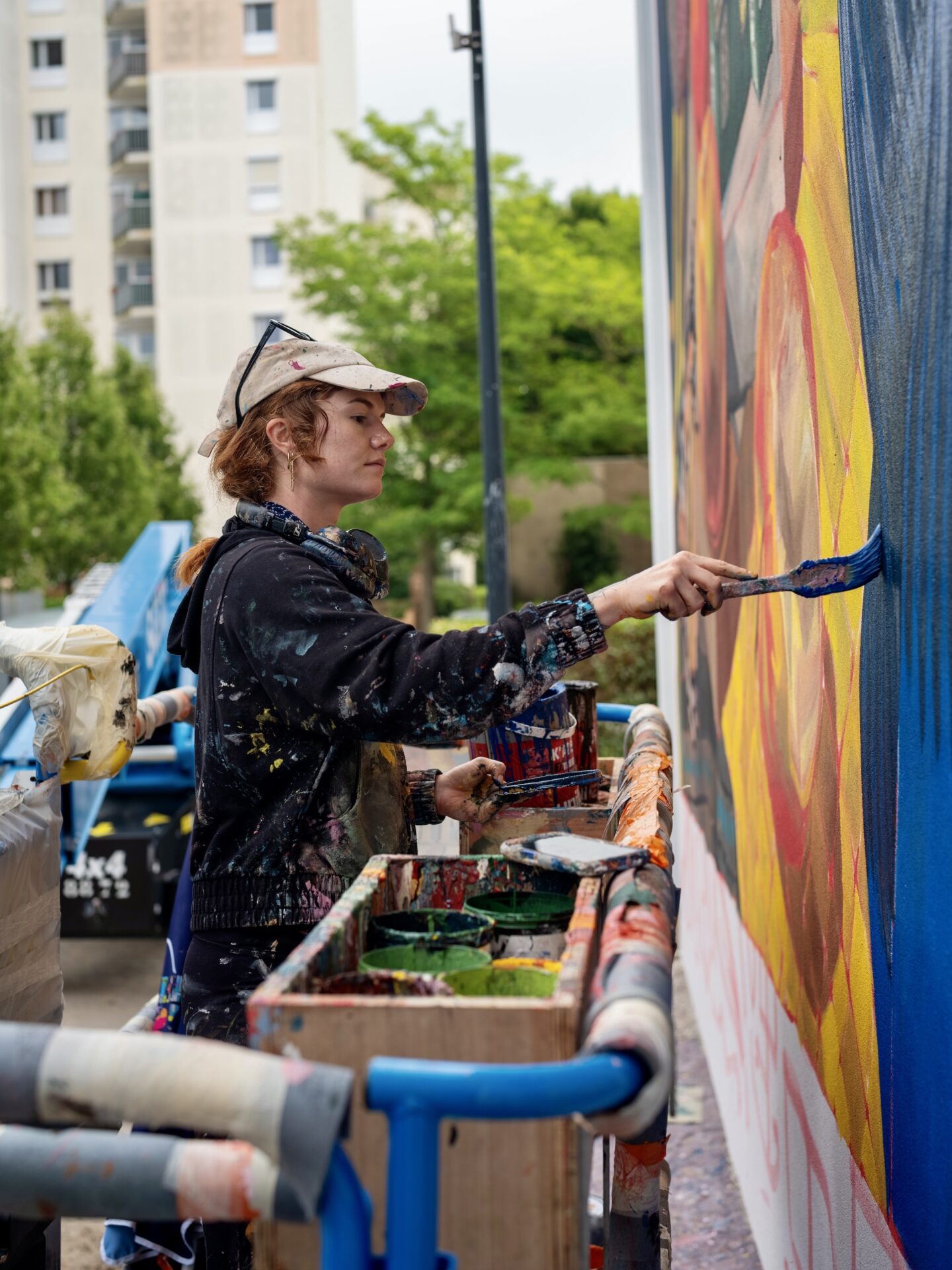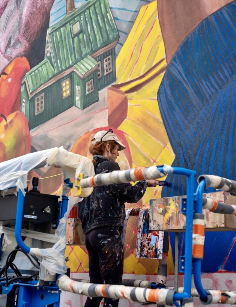 Pour cette magnifique fresque, pas d’aérosol. Tout est réalisé au pinceau. « Je suis de la vieille école » sourit Jasmine Crisp. « J’ai commencé avec la peinture à l’huile. Il n’y a que cinq ans que je réalise des murs comme celui-ci. J’essaye de suivre ma technique et de l’adapter en passant de la toile au mur. »