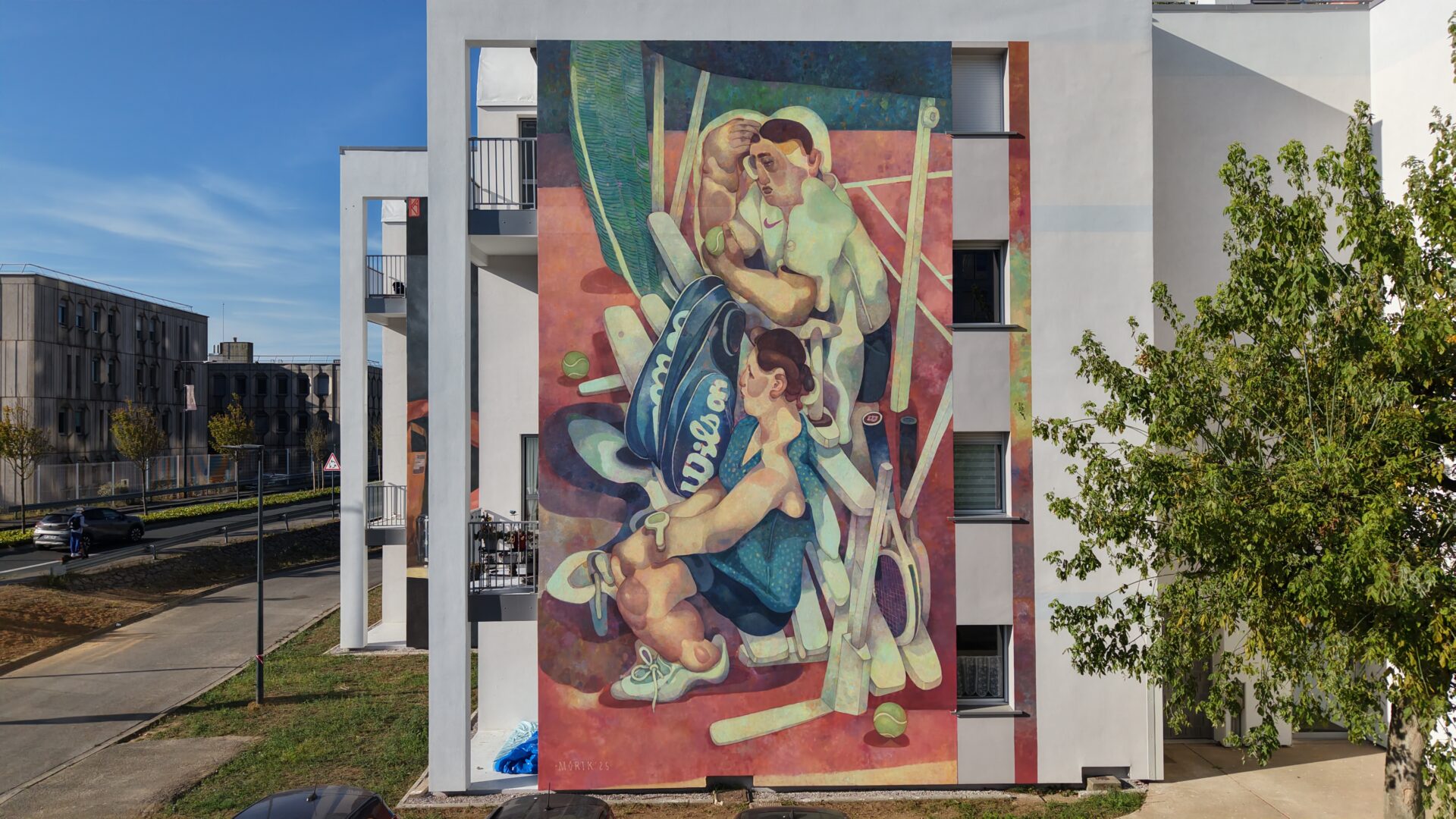 Une image totalement retravaillée autour de personnages aux formes géométriques massives, symbole du cubisme. « J’avais essayé plusieurs de mes dessins pour ce mur et j’ai trouvé que c’est cette composition qui se mariait le mieux à l’endroit » reprend Marat Morik. « J’avoue que ce n’est pas spécialement en relation avec les habitants mais plus quelque chose qui me parle. Le tennis est aussi un sport universel, donc je me suis dit « pourquoi pas ? » (rires) »