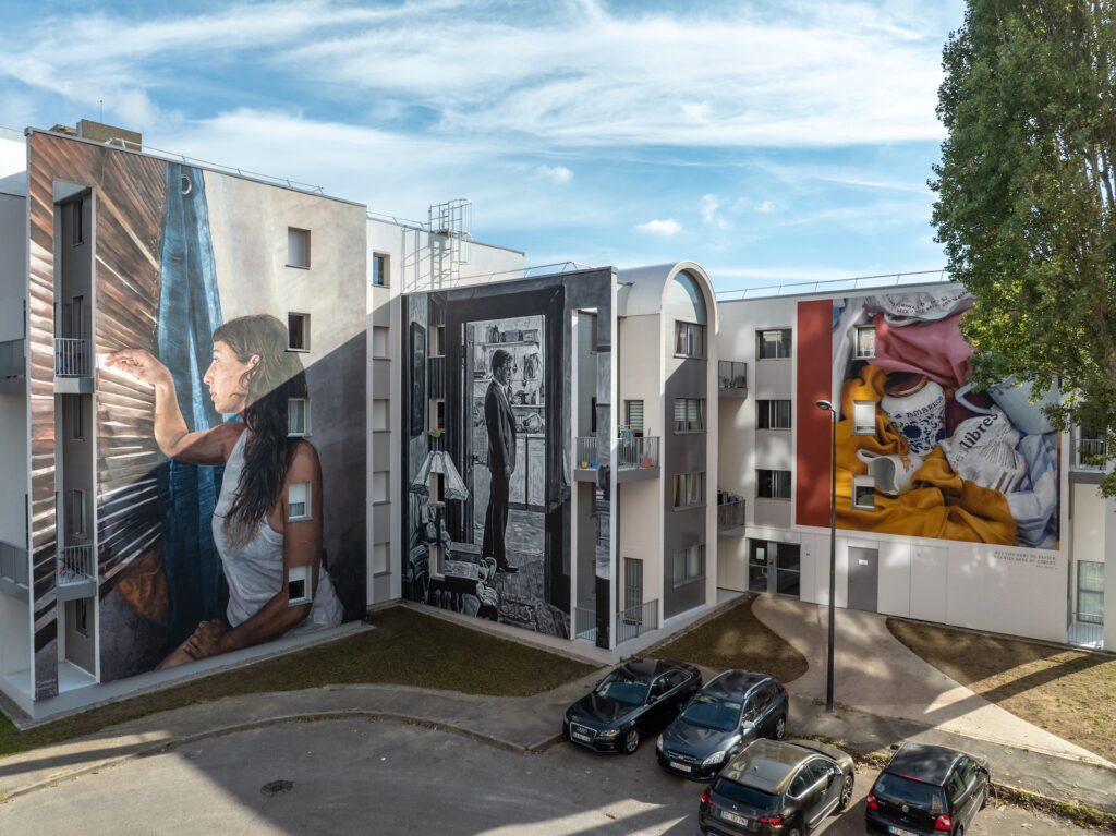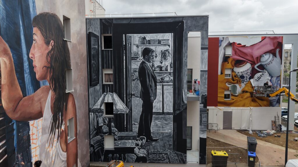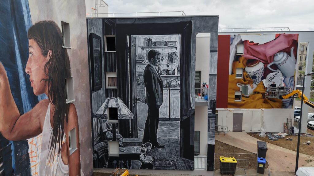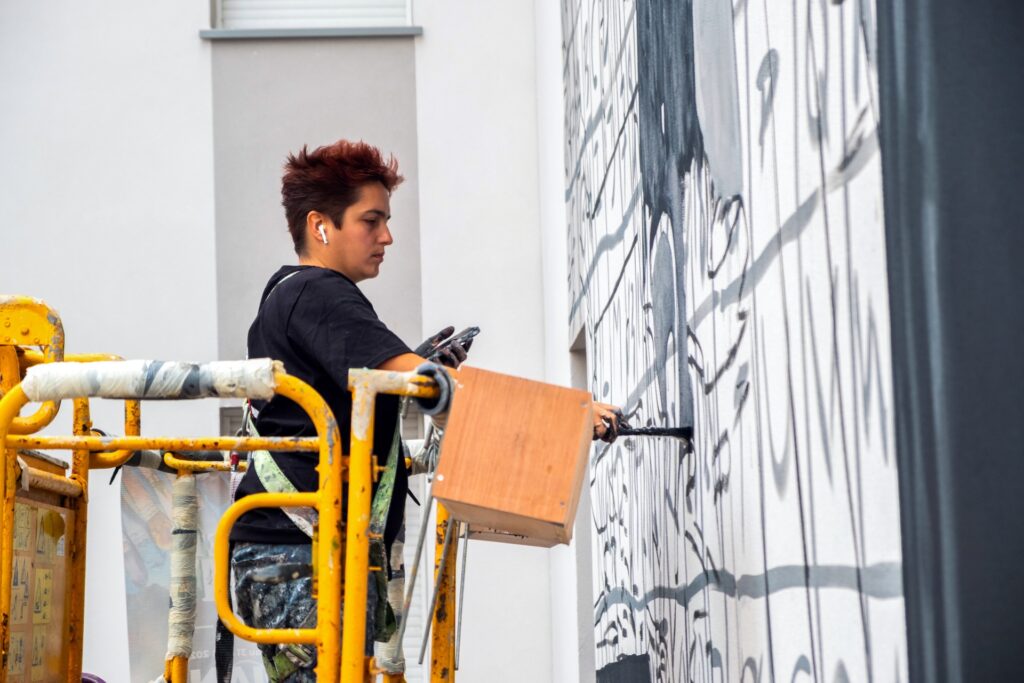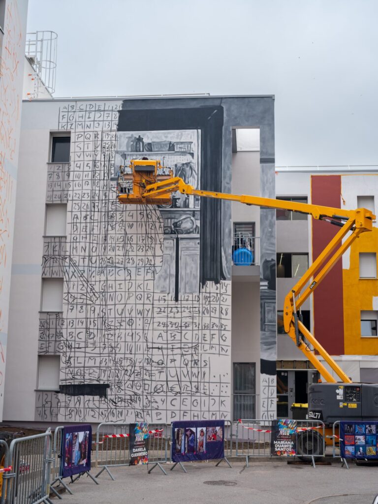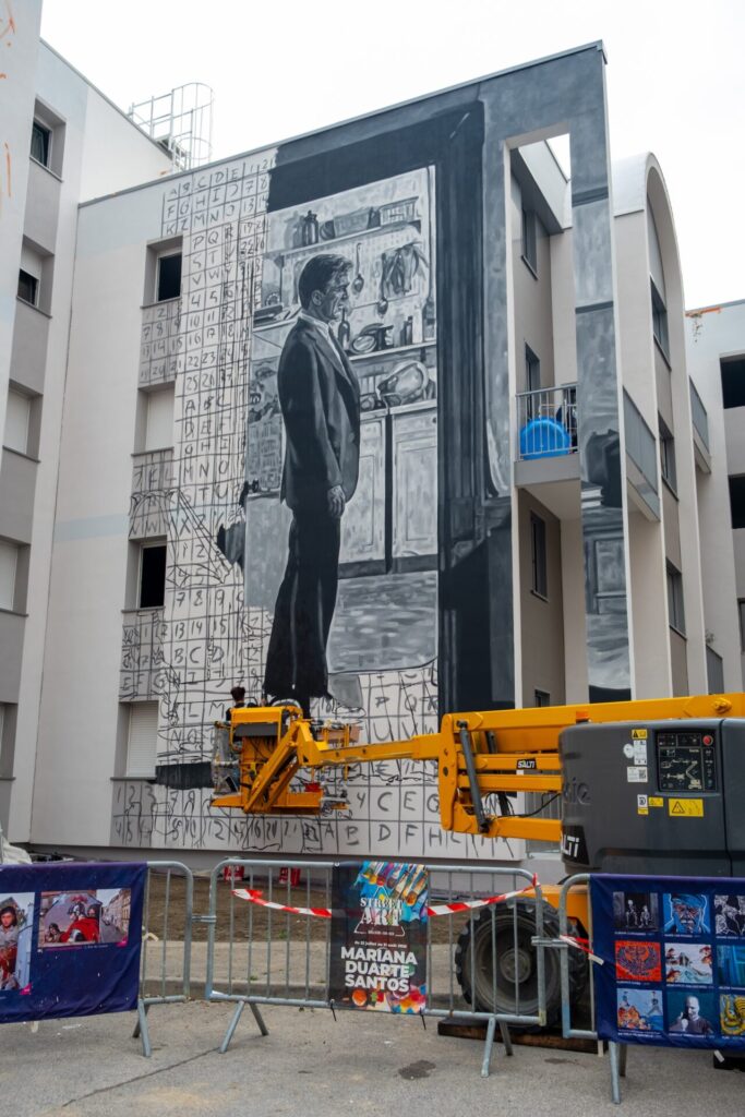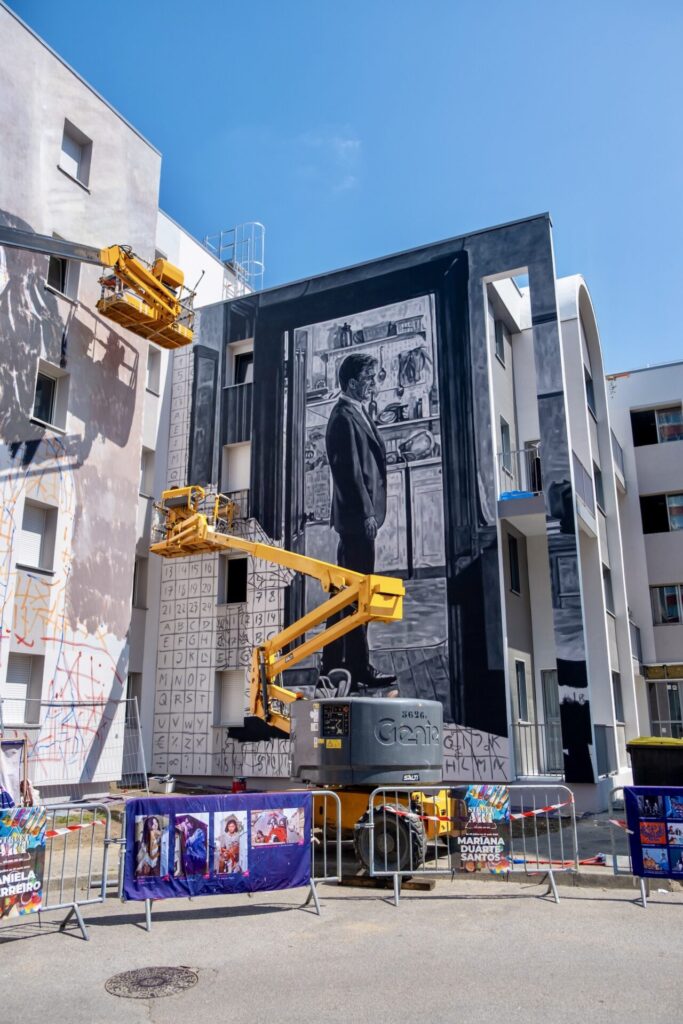 Artiste Lisboète d’abord attiré par les arts plastiques, le dessin et la gravure, Mariana Duarte Santos se plonge dans l’univers du street art en 2019. Elle a depuis réalisé plus de 50 fresques au Portugal, au Luxembourg, en Espagne et en Irlande. Elle posera donc pour la première fois ses pinceaux en France et apportera au quartier de la gare son regard, sa façon d’observer et de percevoir le Monde en créant des œuvres figuratives inspirées par le cinéma et la littérature. Un travail global dans lequel Marianna Duarte Santos intègre une notion de mémoire autour de l’identité et des récits collectifs. Les images d’archives occupent souvent une place centrale dans ses créations où ses personnages développent leur propre relation à l’espace physique et psychologique.