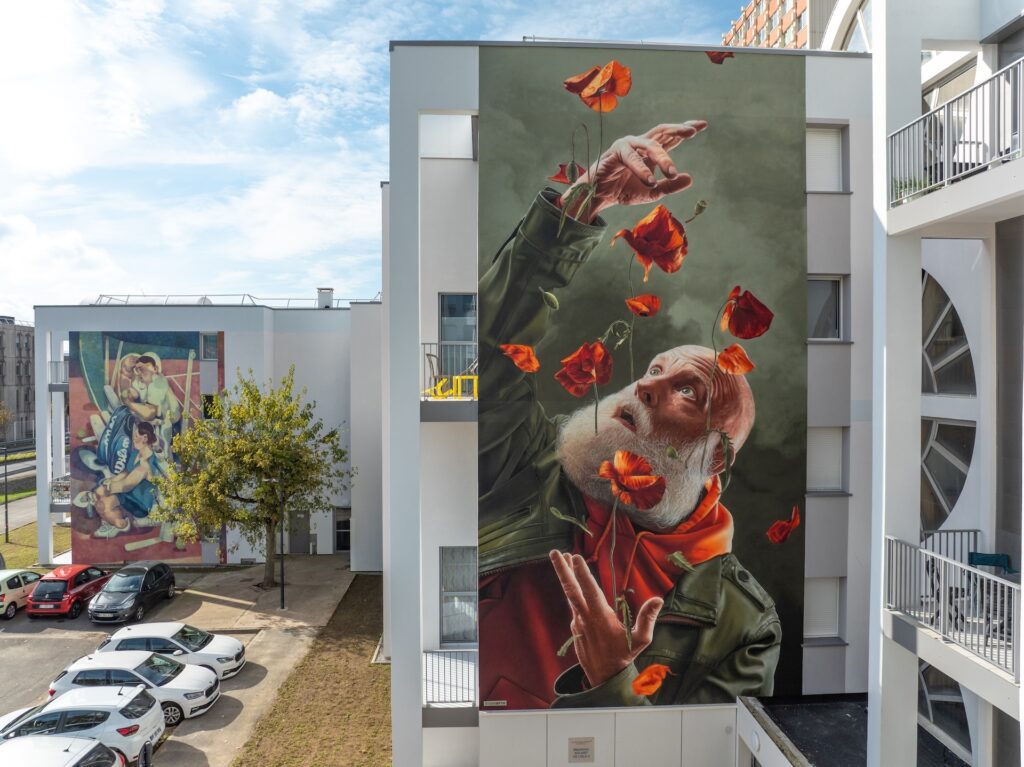 Niels van Swaemen et Kaspar van Leek travaillent ensemble depuis 2007 et ont posé pour la première fois leurs pinceaux à Boulogne-sur-Mer. Pour réaliser un mur marquant et poétique autour de la figure d’un vieil homme qui semble captiver par des coquelicots qui flottent dans l’air. « Ce mur montre un homme plutôt âgé, très expressif » explique le duo. « Il représente la sagesse et l’expérience que l’on acquiert peu à peu dans la vie. Autour de lui et dans sa main, des coquelicots prennent vie et pour certains sortent de son corps et grandissent. Ces fleurs sont un symbole. Elles représentent le fait que si la vie est parfois difficile, de toutes ces expériences compliquées ressort quelque chose de positif, de nouveau et de bon. C’est une métaphore du cycle de la vie. »