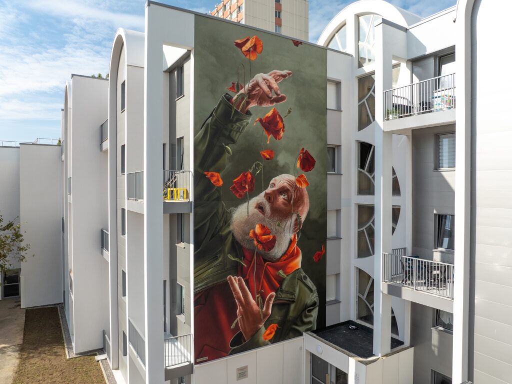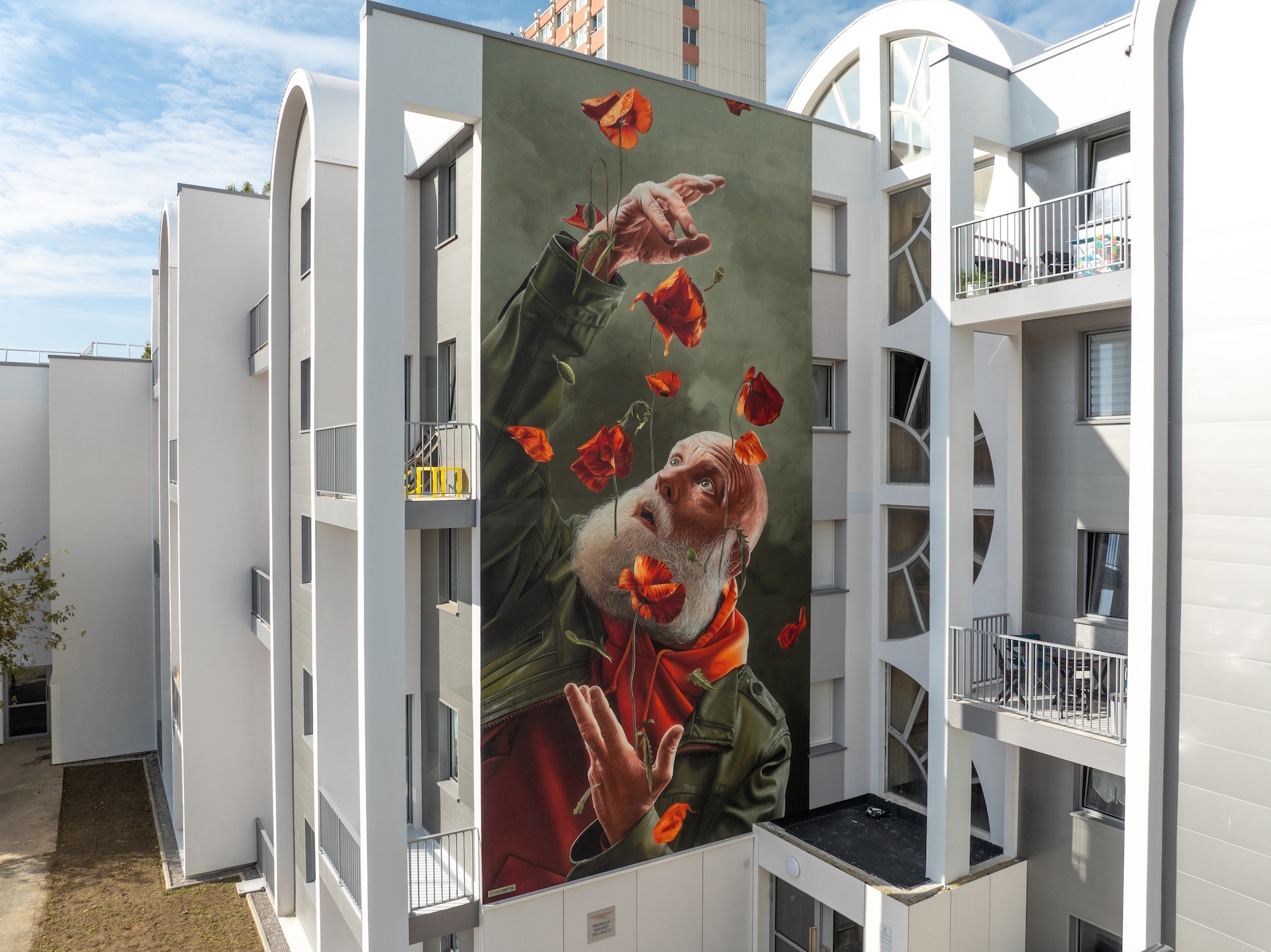 Le coquelicot est connu pour représenter la résilience et l’espoir. Ces fleurs peuvent apparaître sur de nouveaux terrains chaque année. « Chaque fleur a sa propre symbolique que l’on n’associe pas forcément à l’endroit où l’on réalise la fresque » continue Studio Giftig. « Ce mur s’inscrit dans notre démarche artistique globale. Pour réaliser nos personnages, on aime s’inspirer de portraits que l’on réalise nous-même dans la rue, parfois en studio ou que l’on peut voir sur les réseaux sociaux comme facebook et Instagram ce qui est le cas pour ce vieil homme. »